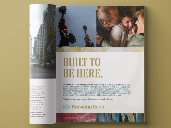 Inspired by regional roots, the name Bonvenu is a modern mashup of “bon” (the French word for good) and “bienvenue” (the French phrase for welcome). The “Built to Be Here” positioning communicates commitment to customers and community and speaks to the energy of the region. The new Bonvenu Bank provides a good welcome from a brand that’s alive with a vibrant Louisiana spirit.