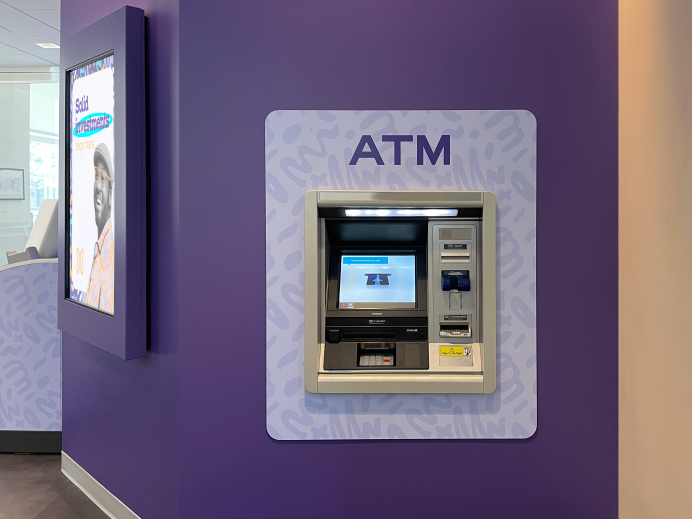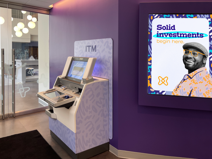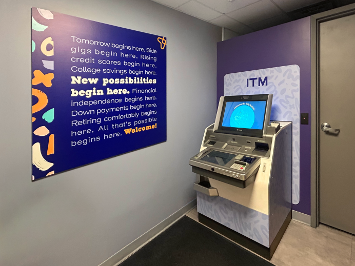 Environmental branding plays a large role bringing the brand to life within the branch, drawing upon the brand’s bold color palette and pattern treatments, and using relatable imagery of Gen Z members achieving their financial goals.